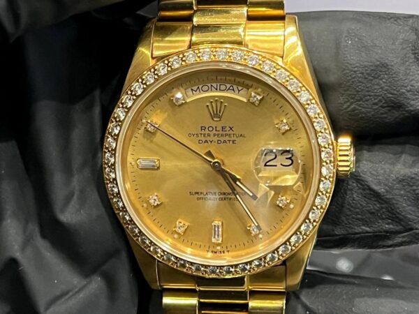 18金イエローゴールドの輝きに加え、ベゼルとインデックスに贅沢に配されたダイヤモンドが圧倒的な存在感を放つ至高の一本です。デイデイトはプラチナやゴールドといった貴金属素材のみで展開されるロレックスの最上位モデルであり、まさに「成功者の証」と呼ぶにふさわしい逸品です。