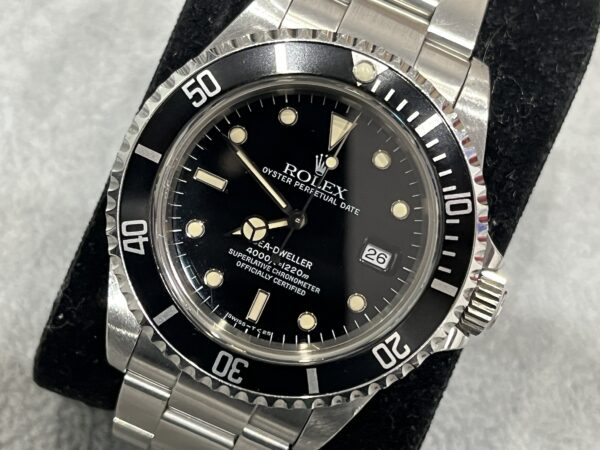 鑑定士として今回高額査定を提示できた最大の理由は、外装の「未研磨に近い状態」を評価した点にあります。ロレックスのプロフェッショナルモデルにおいて、ケースの肉厚感やラグのシャープさは資産価値を左右する極めて重要な要素です。何度も磨き(ポリッシュ)をかけて痩せてしまった個体とは異なり、この16600は本来の力強いフォルムを維持していたため、市場での最高ランクとして評価させていただきました。また、当時の純正ボックスや保証書、そしてシードゥエラー特有の付属品である「ツールキット」が欠品なく揃っていたことも、プラス査定の大きな決め手となりました。